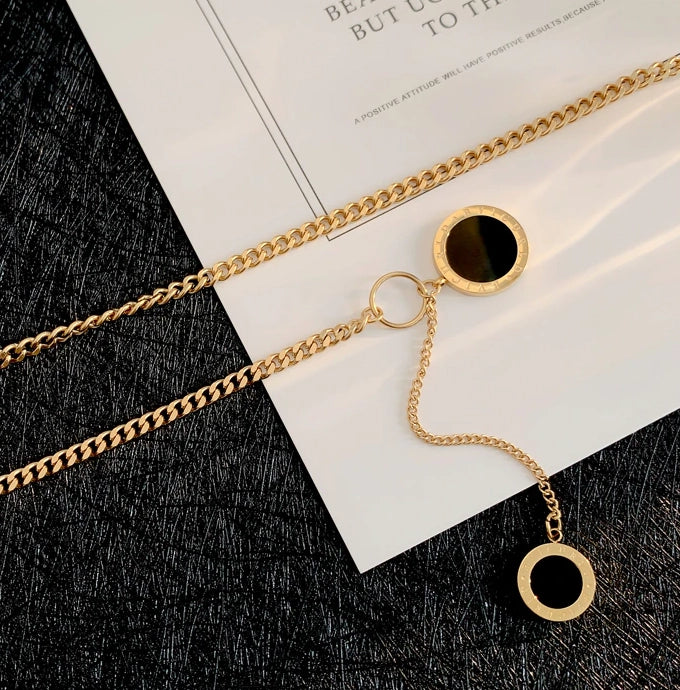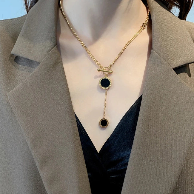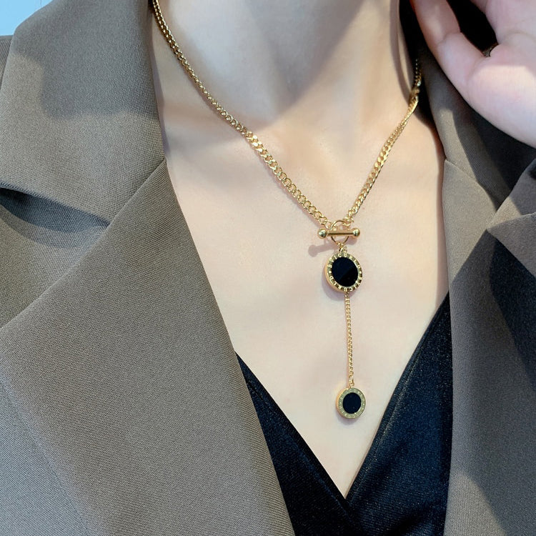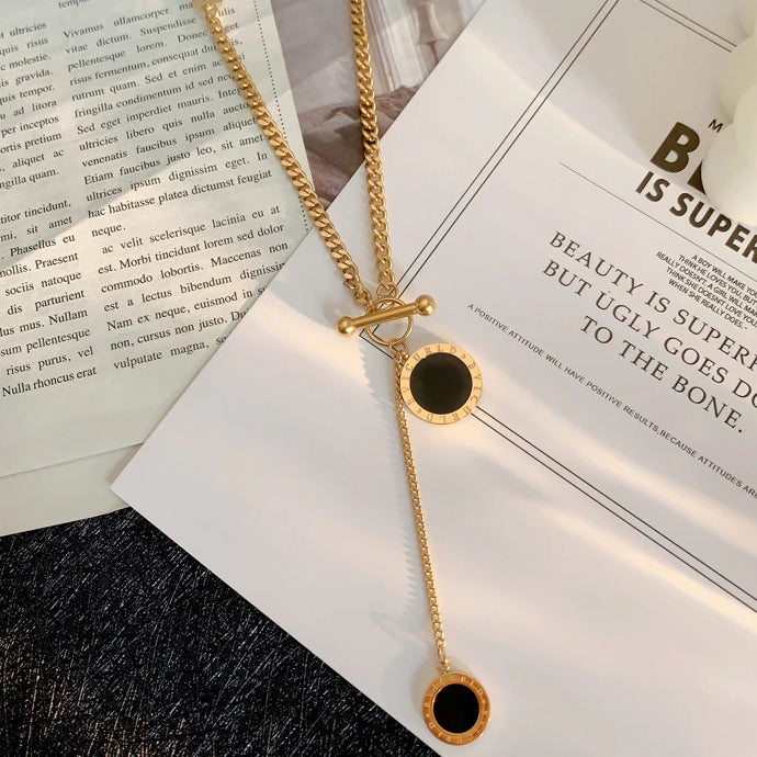 Show off your sophisticated side with this Black Roman Letter Pendant Stainless Steel Necklace. The sleek and simple design, featuring a black stainless steel letter pendant on a gold-coloured chain, adds an element of elegance to any outfit. Whether you're dressing up or down, this necklace is the perfect accessory to complete your look.