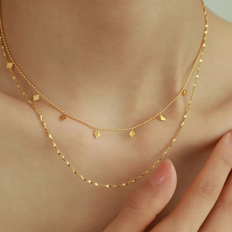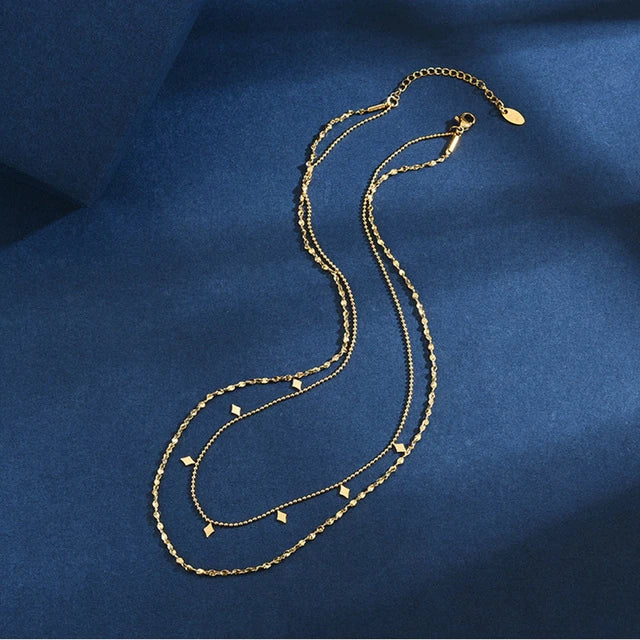Upgrade your jewelry game with this double-layered thin stainless steel necklace. With a gold finish, this necklace boasts a sophisticated and minimalist design that is perfect for any occasion. The pendant is sleek and understated, making it a versatile addition to any jewelry collection. With its lightweight construction and adjustable length, this necklace is perfect for layering with other necklaces or wearing on its own for a more minimalist look. Whether you're dressing up for a special event or adding a touch of glam to your everyday look, this necklace is sure to impress.
