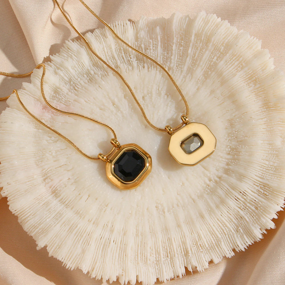 Make a statement with this geometric rectangle large cubic zirconia stone pendant necklace. The gold colour and stainless steel metal type ensure durability, while the cubic zirconia stone adds sparkle. The unique design adds a modern touch to any outfit.