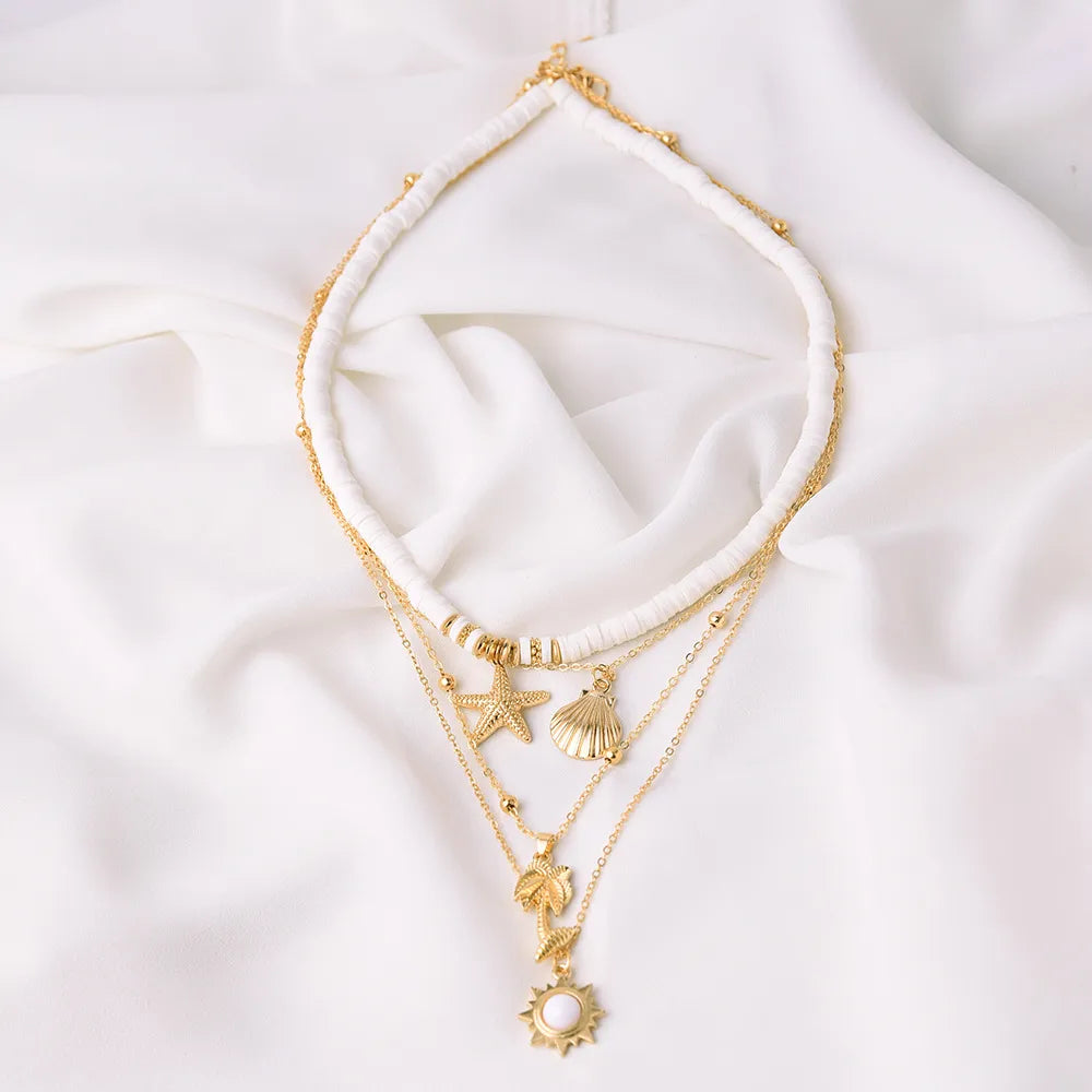 Take a walk on the wild side with our Bohemia Soft Clay Shell Star Sun Pendant Chain Layered Necklace. This bohemian-inspired necklace features a layered chain design, made from high-quality zinc alloy, and a unique pendant that showcases soft clay, a shell, a star, and a sun. Its gold finish adds a touch of luxury, while its layered design creates a stunning statement piece that will turn heads.