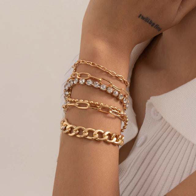 Shine bright like a diamond with this luxury shiny rhinestone bracelet set. With four pieces to mix and match, this bangle set is the ultimate fashion accessory. Made from alloy and crystal, it is both sturdy and glamorous. Available in gold or silver, this bracelet set is perfect for any occasion.