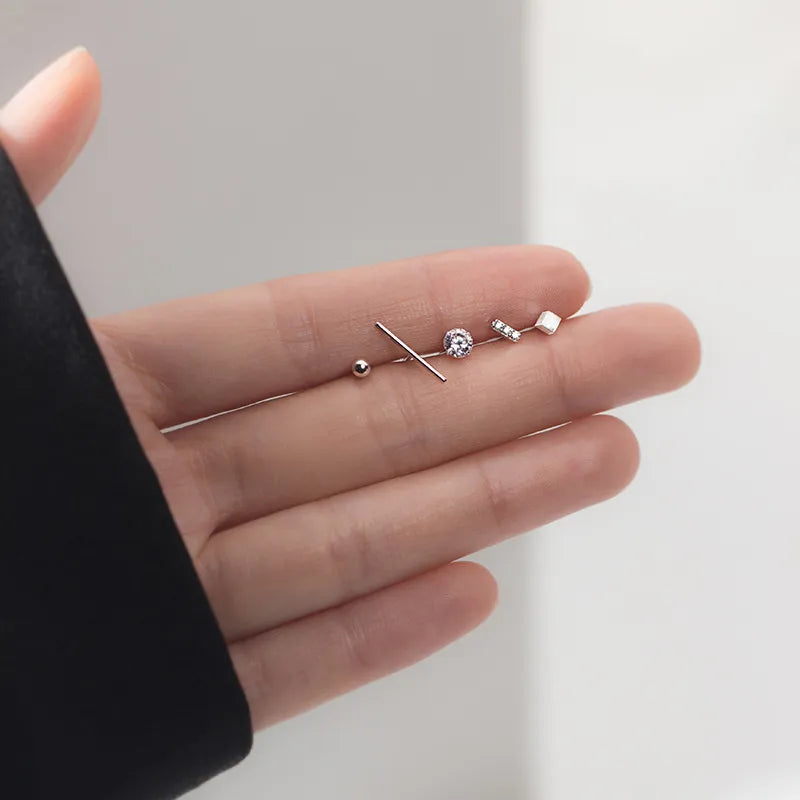 Add some variety to your jewelry collection with this set of five sterling silver stud earrings. Featuring a range of geometric shapes and sparkling zircon stones, these earrings are both versatile and stylish.