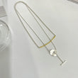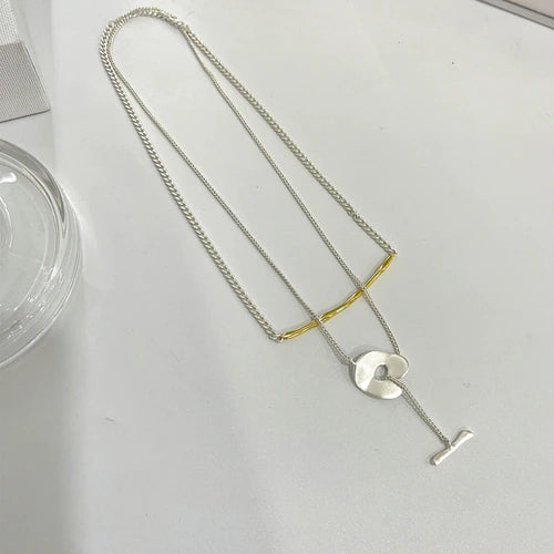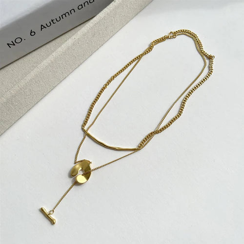 Add a touch of modern style to your wardrobe with this trendy two-layer pendant necklace. Made of zinc alloy with a gold finish, this necklace features a unique geometric design that is both edgy and chic. The pendant is beautifully crafted with a shimmering main stone that adds a touch of sophistication to the piece. With its adjustable length, this necklace can be worn at different levels to suit any outfit or occasion. Whether you're dressing up for a special event or adding a touch of glam to your everyday look, this necklace is sure to make a statement.